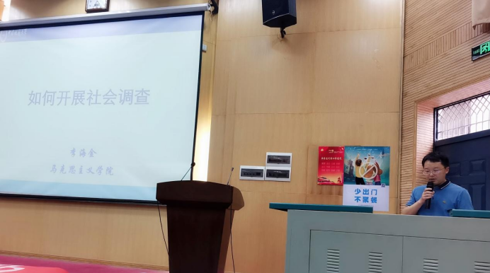 最后,李海金副院长作《社会调查方法》专题报告,对参会师生进行社会调查方法培训。他从如何进行选题、如何设计调查方案、如何进行社会调查、怎样撰写调查报告四个方面介绍,对开展社会调查及完成调查报告的相应步骤及方法进行完整的讲述。他强调,一份高质量的调查报告源于科学合理的调查设计,具有高信度、高效度的数据资料收集,并且需要对资料进行正确适当的分析,希望同学们在实践中注重数据资料收集,注重数据分析方法的运用,顺利完成社会调查活动。